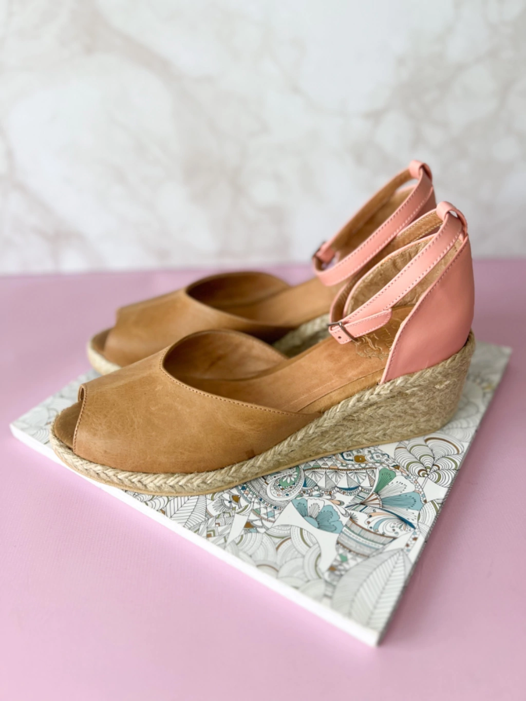 Spadrilles con capellada en cuero suela, y talon y pulsera al tobillo en cuero. La pulsera es desmontable y regulable.
