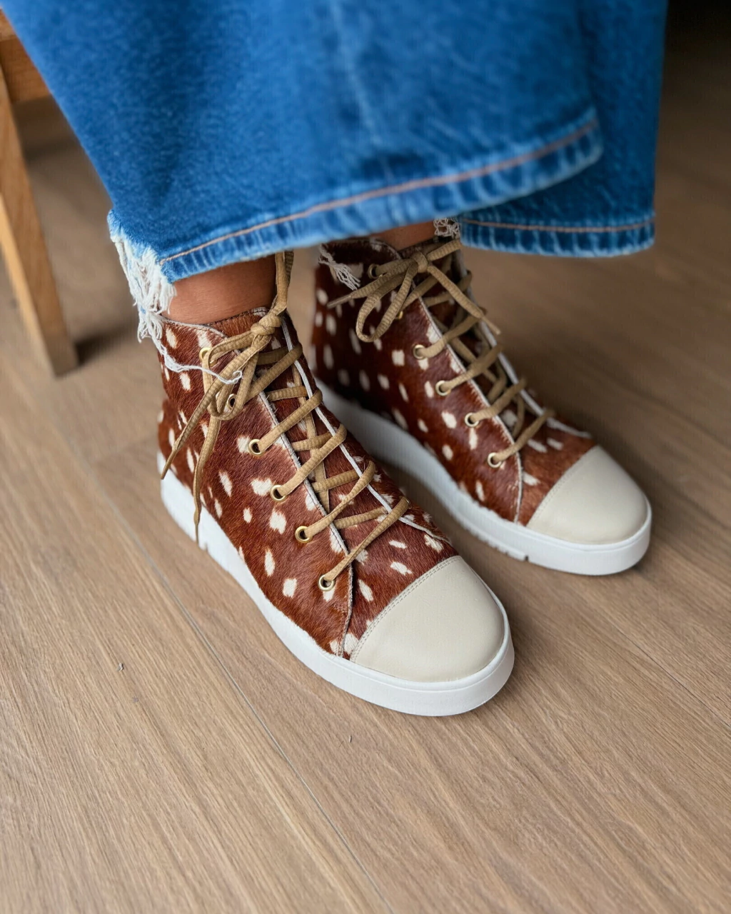 Caña alta con base de goma, capellada en pelo animal print. Puntera en cuero vacuno.